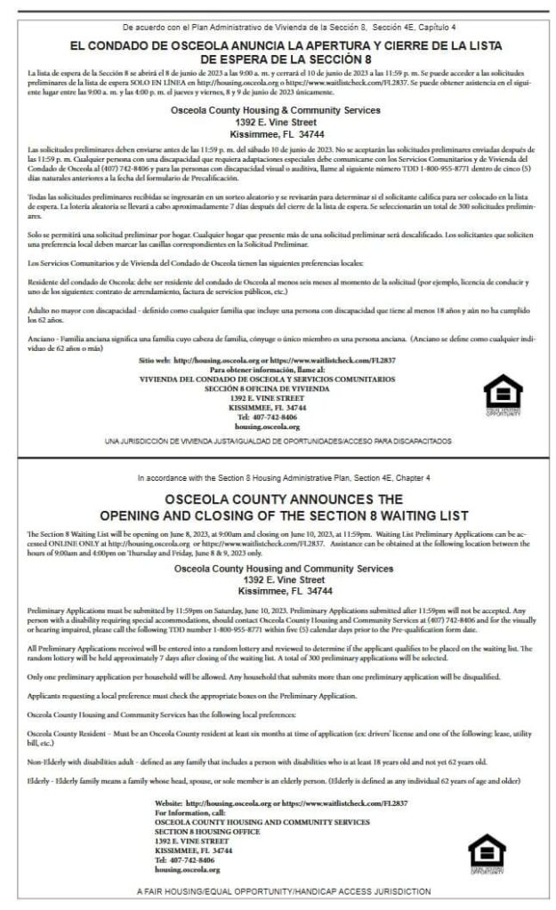 Condado de Osceola anuncia apertura y cierre de lista de espera de la sección 8