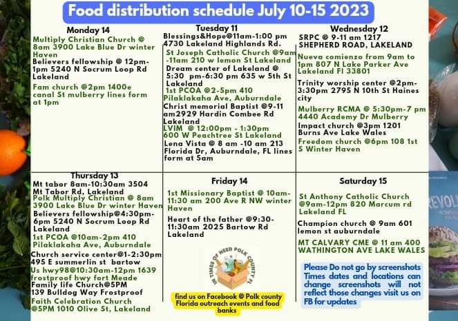 Food distribution schedule July 10-15 2023