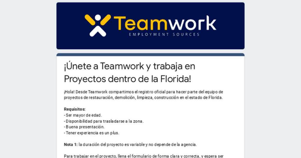 !Unete a Teamwork y trabaja en proyectos dentro de Florida!. Aplique en link